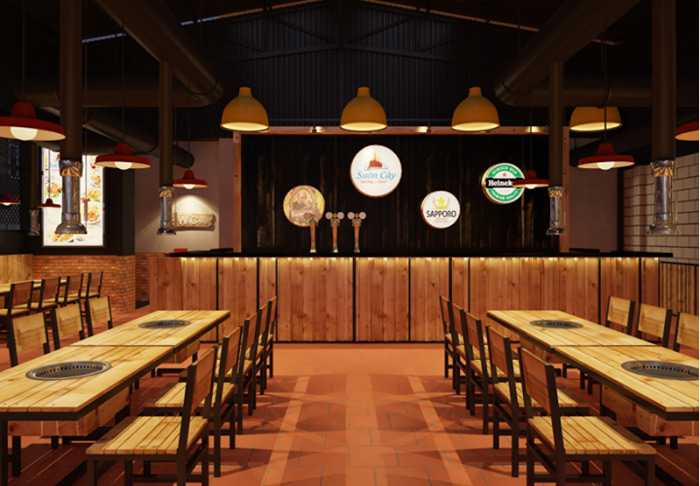 Thiết kế nhà hàng nướng là mô hình kinh doanh độc đáo không kém. Cũng giống như lẩu, món nướng thì được nướng tại bàn để tạo cảm giác thú vị cũng như món ăn giữ được độ nóng.