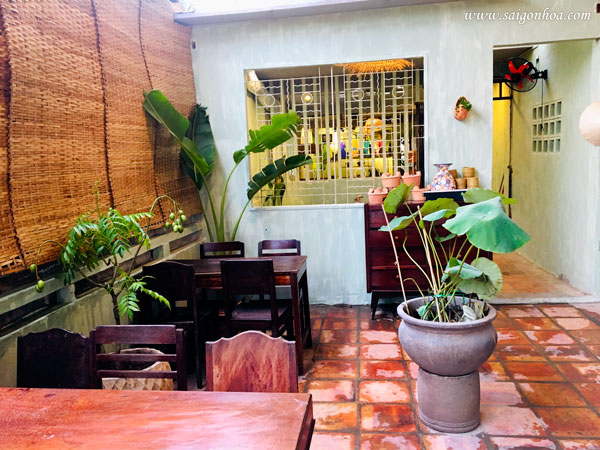Vì không gian quán không quá rộng nên tận dụng trang trí những chậu hoa, chậu cây ở vị trí cửa sổ, hành lang.