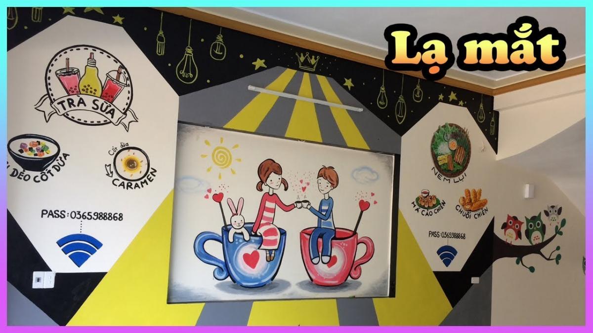 Trang trí quán trà sữa đơn giản bằng cách vẽ tranh độc đáo, tạo điểm nhấn cho căn phòng.