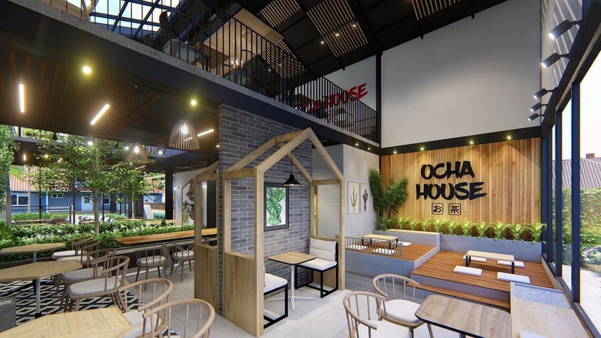 Thiết kế quán trà sữa với điểm nhấn nhiều cây xanh.
