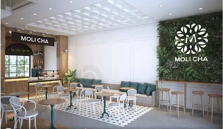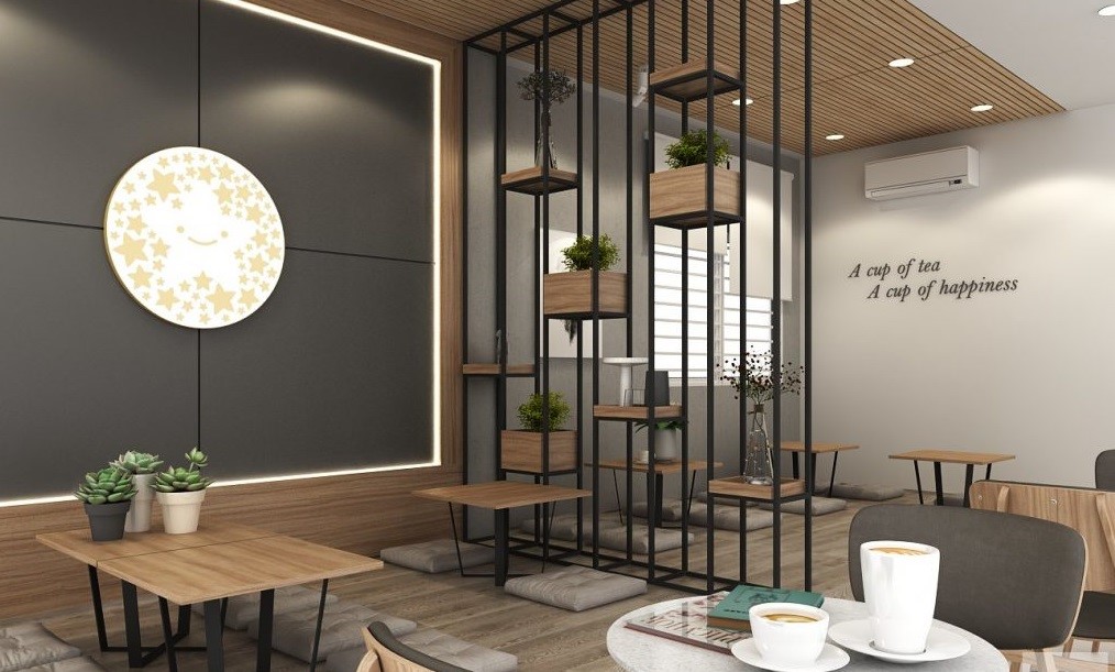 Phong cách trang trí quán trà sữa đơn giản kết hợp với hiện đại.