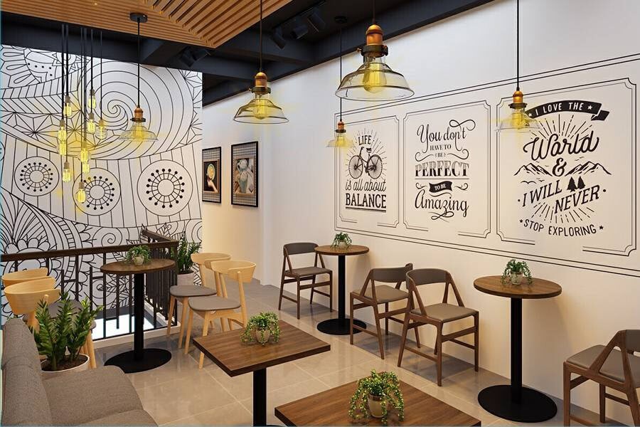 Một quán trà sữa năng động, trẻ trung sẽ phù hợp và được các bạn tuổi teen yêu thích. Bên cạnh đó bạn có thể kết hợp trang trí thêm nhiều vật dụng như tranh treo tường, bóng đèn, đèn led,... để làm nổi bật không gian của quán.