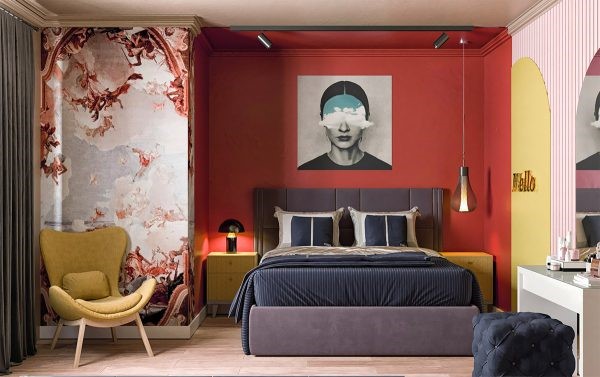 Thiết kế phòng nhỏ nổi bật với tone màu đỏ.